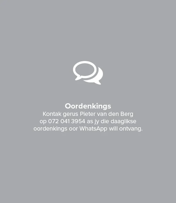 En daarom vra ons ook vir jou: Hoe kan ons jou help... in jou verhouding met God, in jou gebedslewe, in jou navolging van Christus, in die uitvoering van jou (groot)ouerskap, in die hantering van jou finansies, in jou huwelik en ander verhoudings?